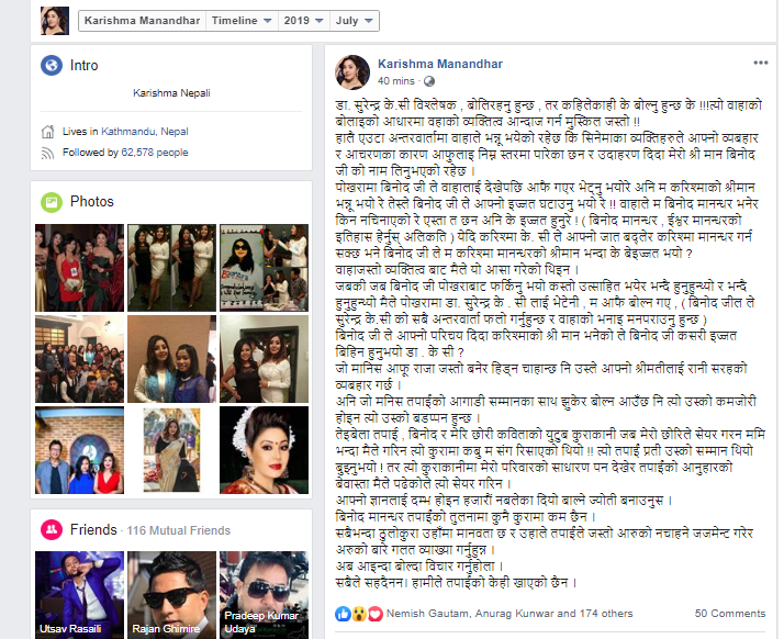'बिनोद मानन्धर तपाईंको तुलनामा कुनै कुरामा कम छैन । सबैभन्दा ठुलोकुरा उहाँमा मानवता छ र उहाँले तपाईंले जस्तो अरुको नचाहिने जजमेन्ट गरेर अरुको बारे गलत व्याख्या गर्नुहुन्न', करिष्माले लेखेकी छिन्।
