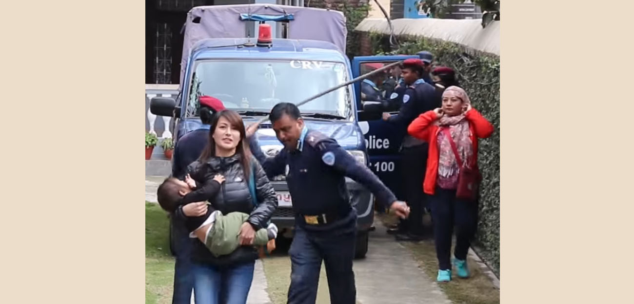 इन्स्पेक्टर पौडेलले काखमा बच्चा बोकेकी हेमा श्रेष्ठलाई प्रहरीको गाडीबाट धकेलेर पछाडिबाट लाठी हानेका छन्।