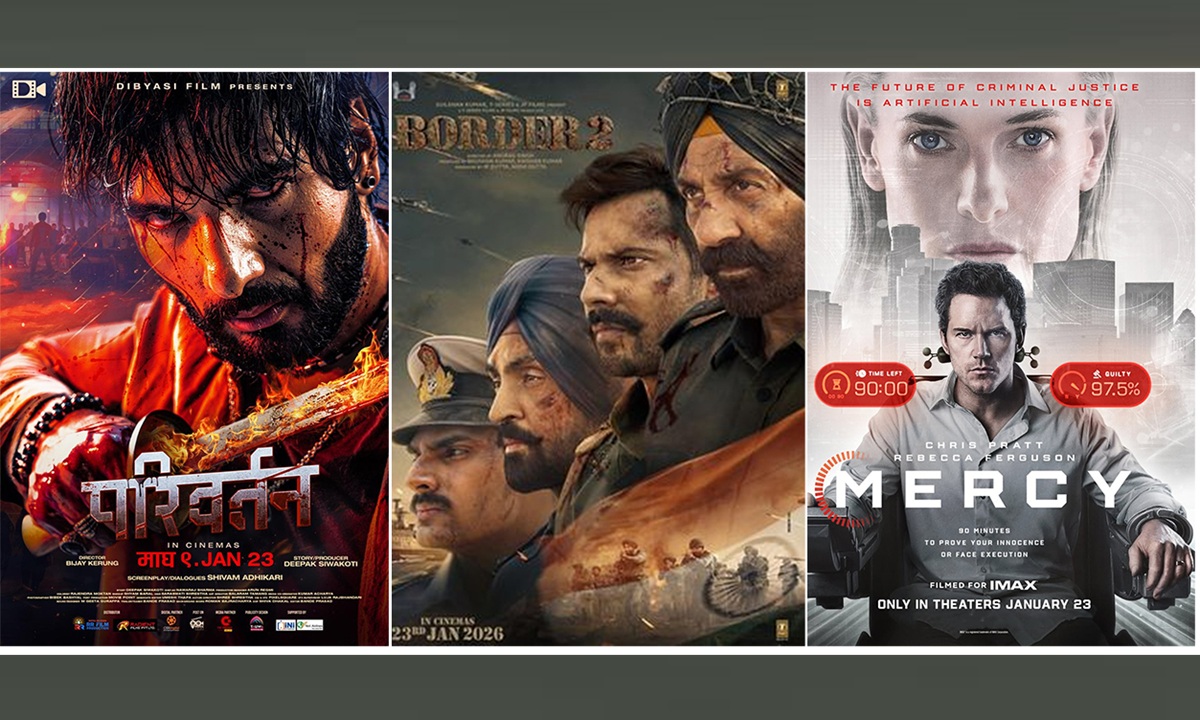 त्यस्तै, सोही दिन बलिउडको वार-ड्रामा फिल्म 'बोर्डर' को सिक्वेल 'बोर्डर २' रिलिज हुँदैछ। अनुराग सिंह निर्देशित फिल्ममा सनी देओल, वरूण धवन, दिलजीत दोसाँझ, अहान सेट्टीलगायत कलाकारहरूको अभिनय छ। सीमा क्षेत्रमा हुने तनाव, सैनिकहरूको व्यक्तिगत संघर्ष र देशका लागि ज्यान अर्पण गर्न तयार भावनालाई फिल्मले कथाको केन्द्रमा राखेको छ।