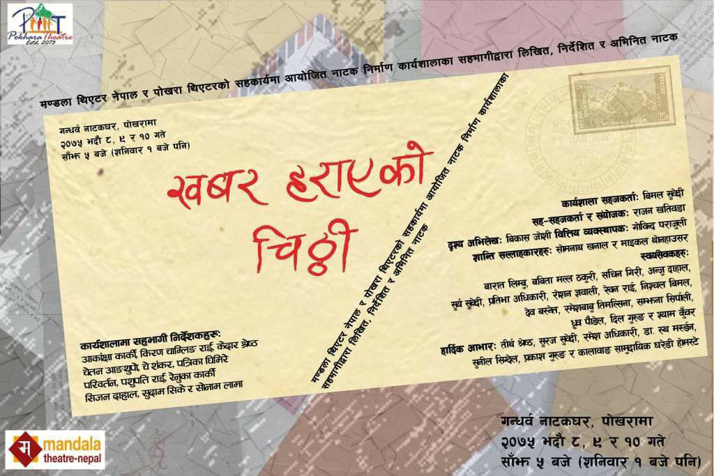 पोखरामा नाटक निर्माण चलिरहँदै म काठमाडौं फर्किएँ। बाँकी प्रक्रिया हेर्न पाइनँ। त्यसपछि विभिन्न प्रक्रिया पार गरेर अहिले नाटक तयार भएको थाहा पाएको छु। फेसबुकको ग्रुप च्याटमा त्यसको पोष्टर र नाटकका केही फोटा आएका थिए। पोष्टरमा लेखिएको थियो ‘खबर हराएको चिठी’।
