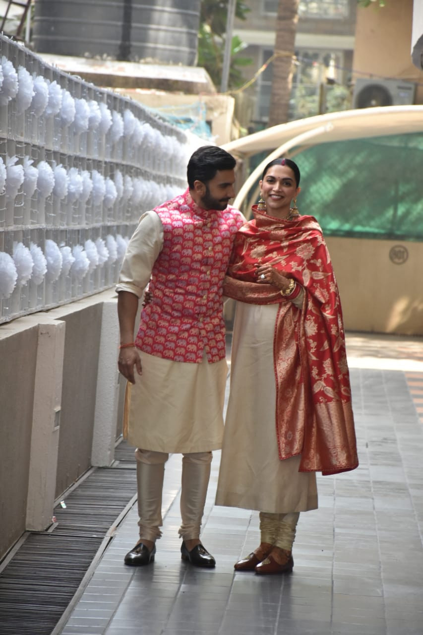 एअरपोर्टमा दीपिका र रणवीर एकै रङको लुगामा देखिएका छन्। रणवीरले घ्यू रङको कुर्तासुरुवालमाथि गुलाबी रङको बुट्टादार इस्टकोट लगाएका छन्।