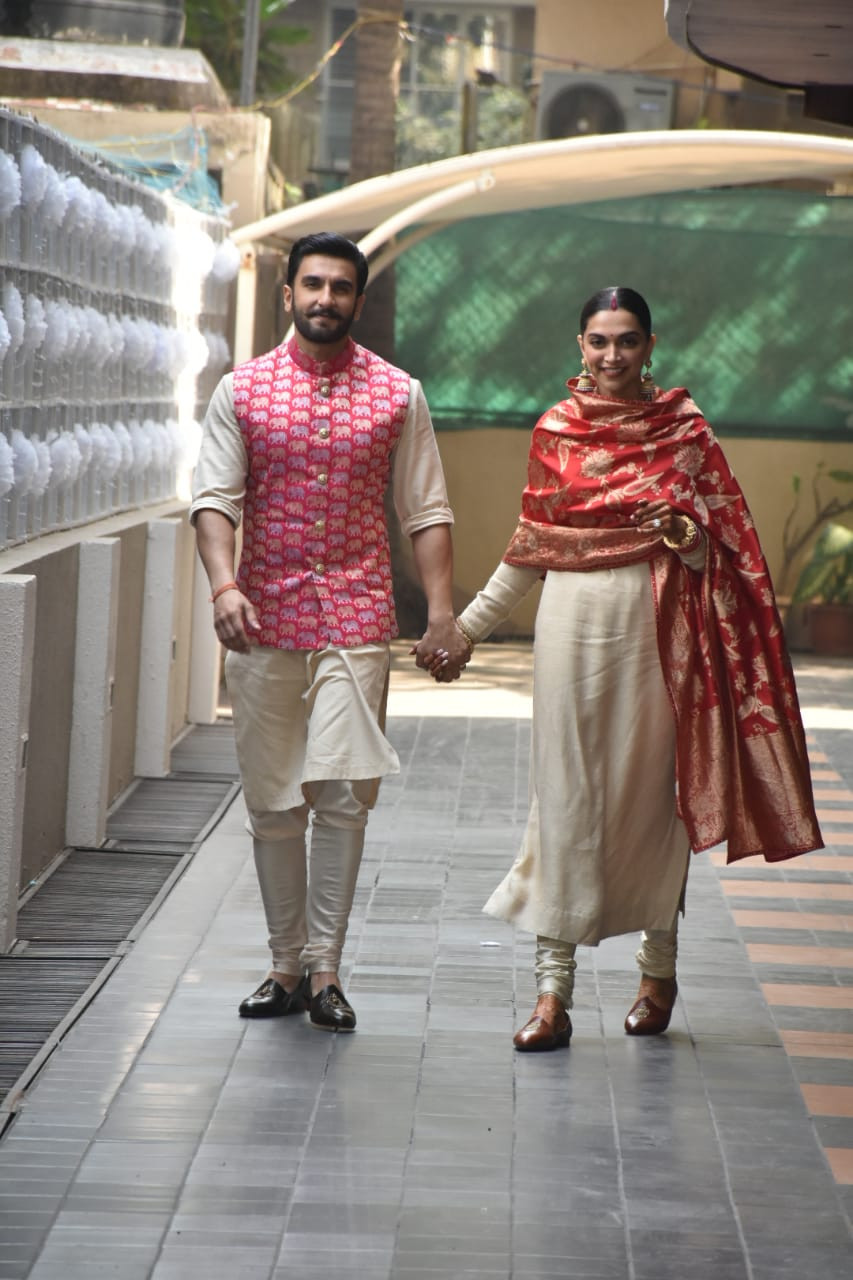 सँगै दीपिकाले पनि घ्यू रङकै लामो कुर्तासुरुवाला लगाएकी छन्। यसमाथि उनले रातो बुट्टादार बनारसी दोपट्टा ओढेकी छन्। हातमा राता चुरा र कानमा ठूला झुम्काले उनको नयाँ बेहुली रुप झल्काएको छ। प्रस्ट देखिने मोटो सिन्दूरको धर्सोले उनलाई खाटी भारतीय बेहुलीको रुप दिएको छ।