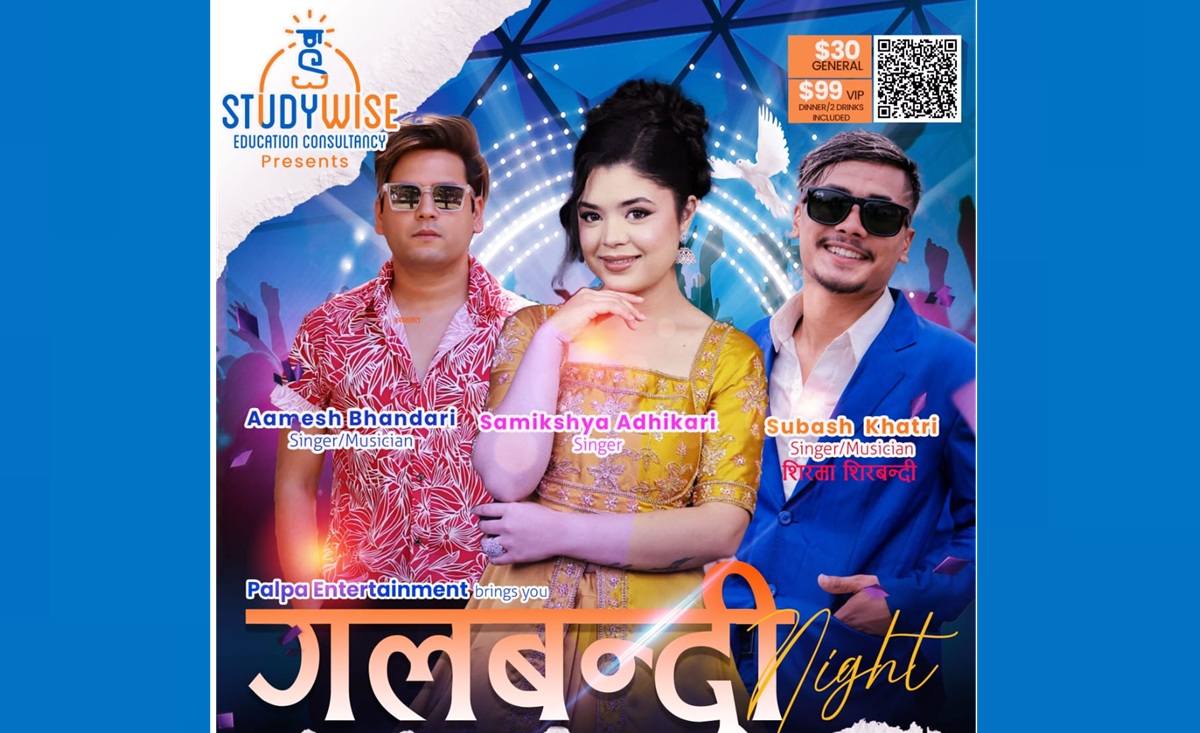 यो कार्यक्रम स्टडी वाइज एजुकेसन कन्सल्टेन्सीको प्रस्तुतिमा नेभा बिजनेस सर्भिसेस प्रा.लि र पाल्पा इन्टरटेनमेन्टले आयोजना गर्न लागेको हो।