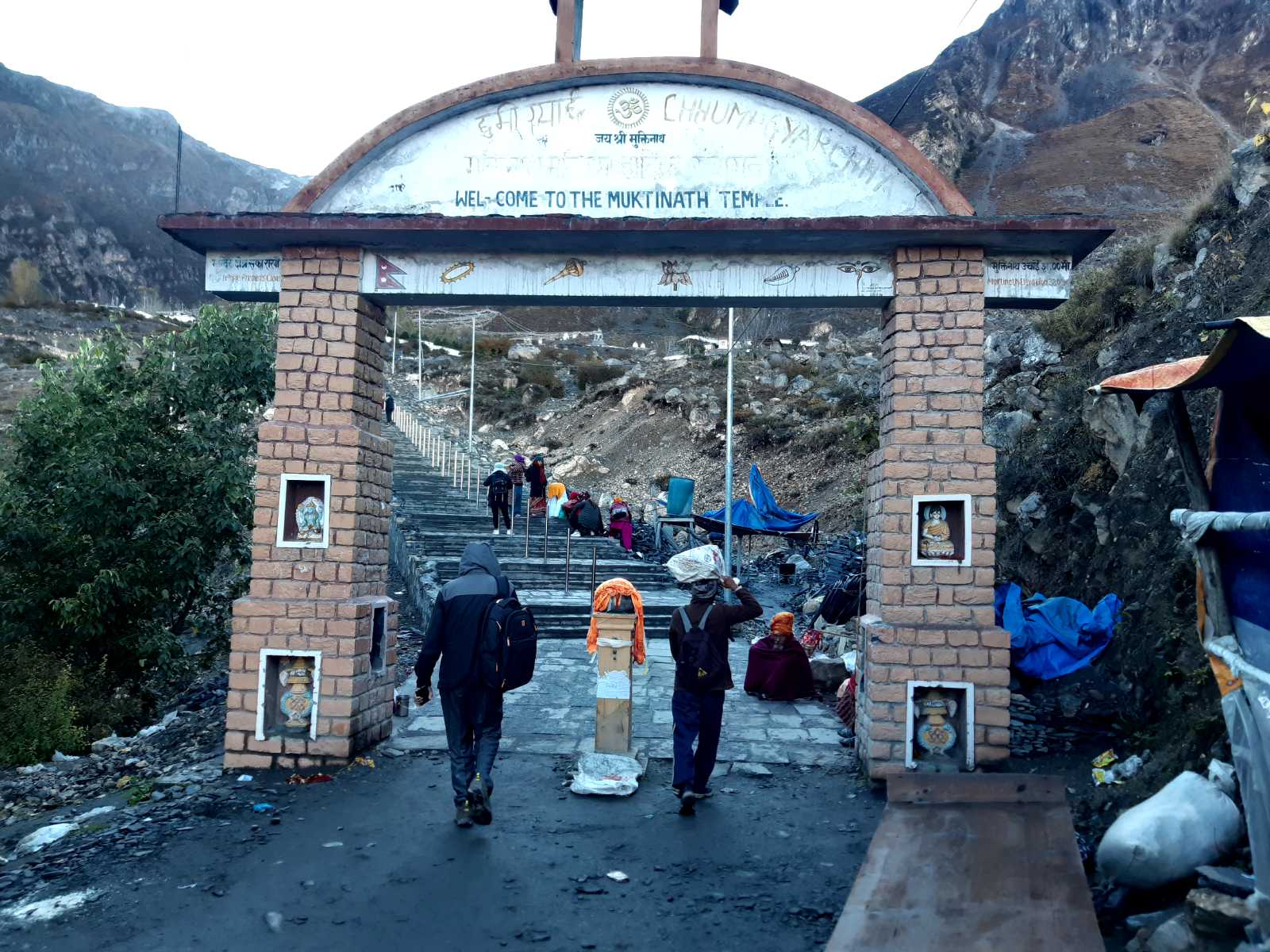 त्यसपछि मन्दिरतिर हिँड्यौं। होटलबाट मुश्किलले १०० कदम हिँडेपछि मुक्तिनाथ मन्दिरको प्रेशद्वार आयो।