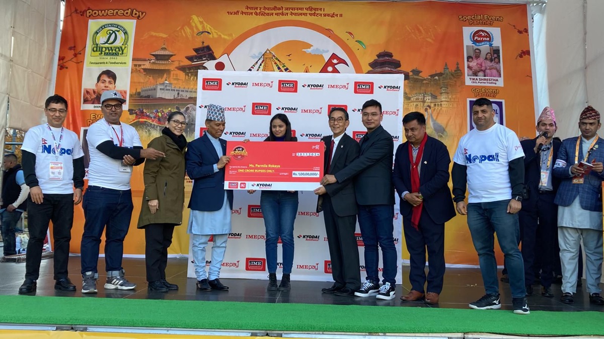 नेपालका लागि जापानका राजदूत डा. दुर्गा बहादुर सुबेदी, आइएमई लिमिटेडका तर्फबाट सुशील थापा र क्योदाइ जापानका युचिरो किमोतोले प्रमीलालाई एक करोडको चेक हस्तान्तरण गरेका हुन्।