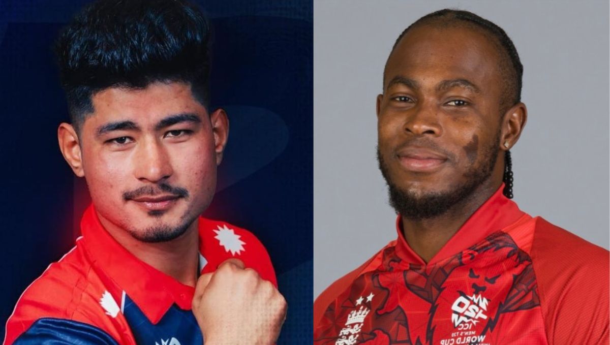 उनै आर्चरसामु ब्याटिङ गर्न क्रिजमा थिए नेपालका दुई ब्याटर — लोकेश बम र आरिफ शेख।