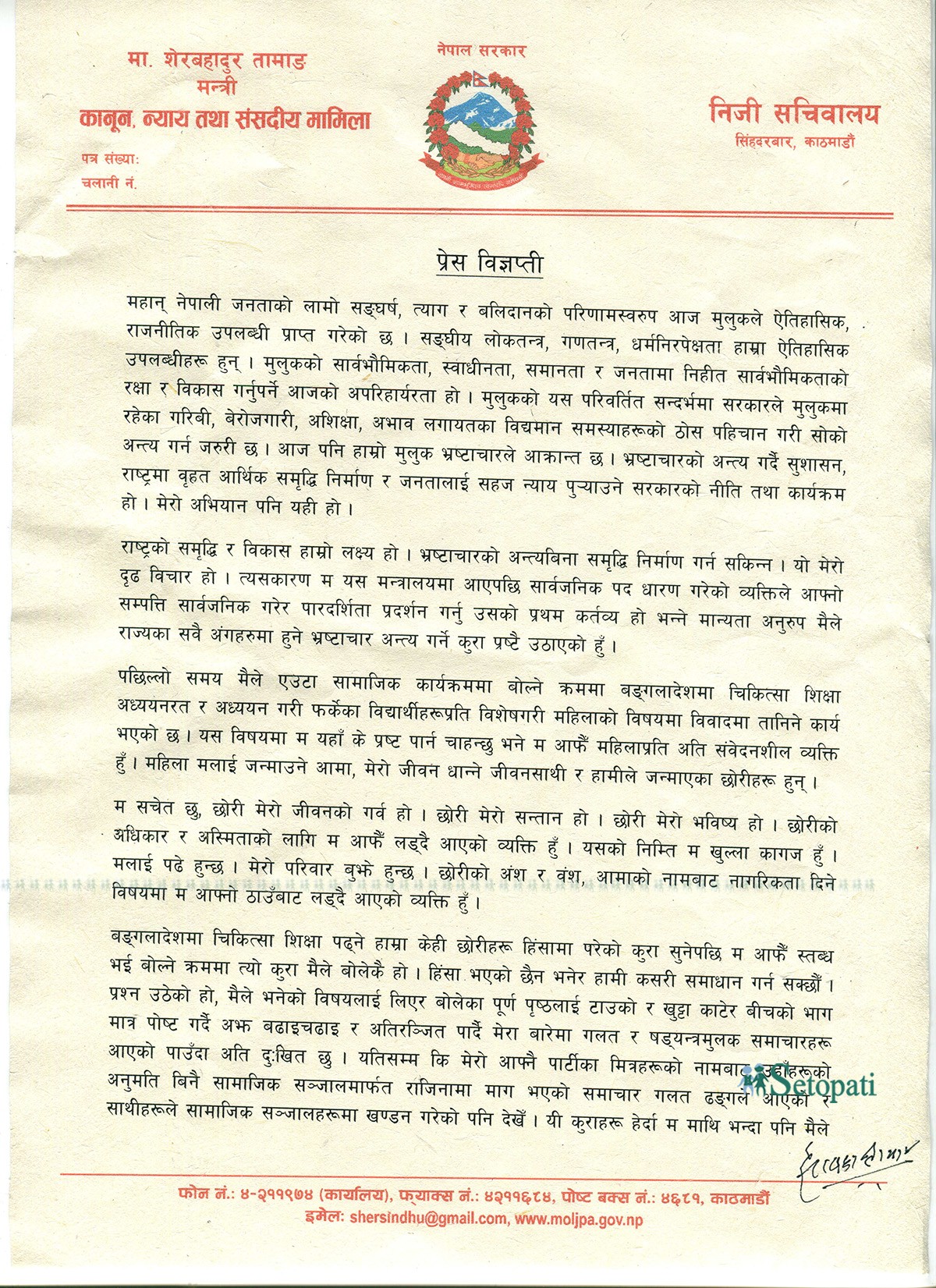 कानुन, न्याय तथा संसदीय मामिला मन्त्री शेरबहादुर तामाङले राजीनामा दिएका छन्।