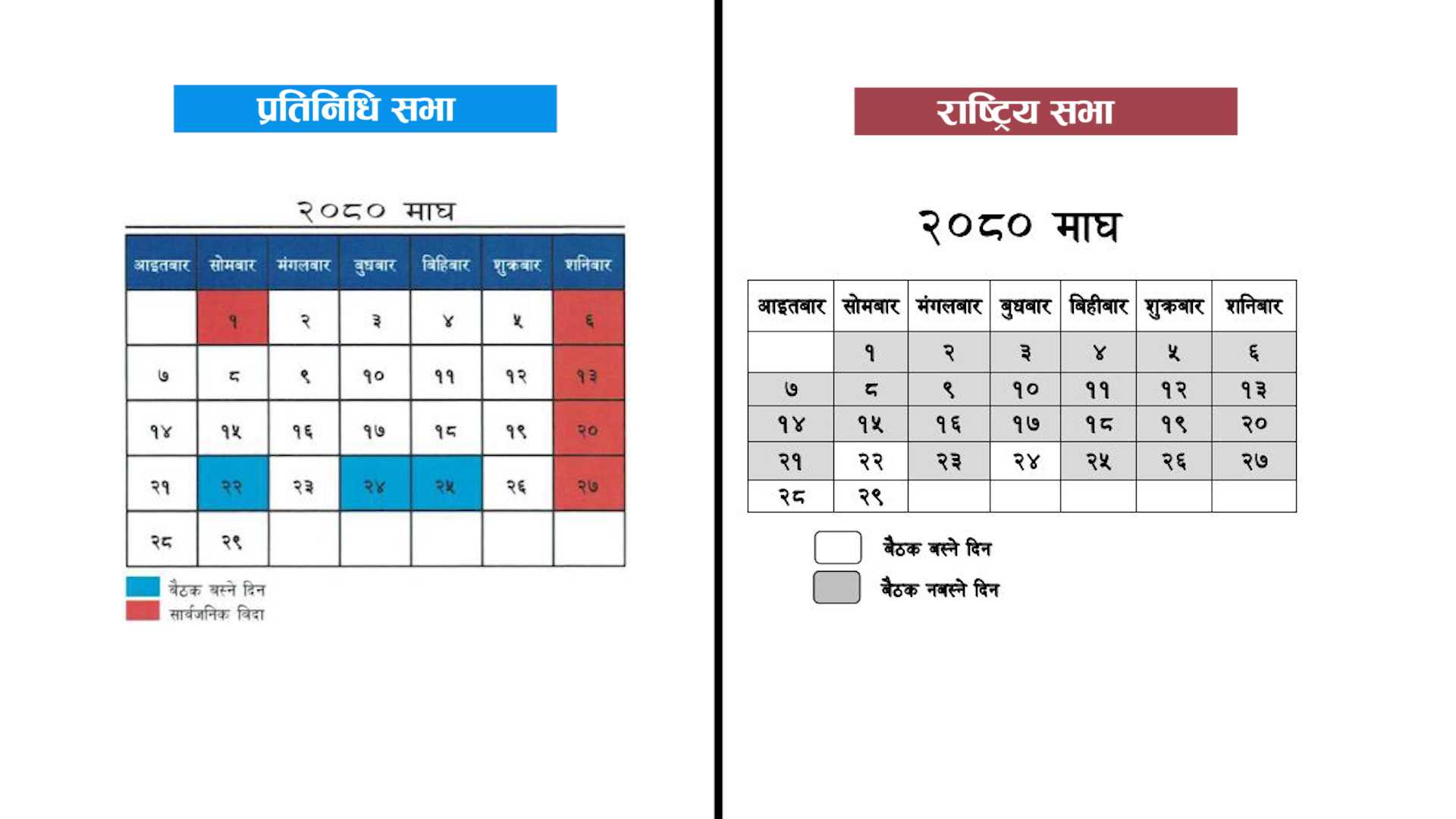 प्रतिनिधि सभाको सम्भावित क्यालेन्डर अनुसार माघ महिनामा २२ गते, २४ गते र २५ गते ३ दिन मात्र बैठक चल्नेछ। संसदको बैठक बिहान ११ बजेदेखि चल्नेछ। हिउँदको बेला छिट्टै रात पर्ने र कार्यालय समय पनि छोटो हुने भएकाले सचिवालयले ११ बजे बैठक बस्ने गरी कार्य तालिका बनाएको हो।