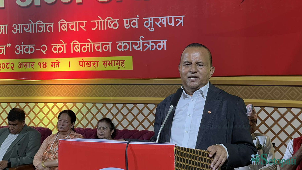 शनिबार एमाले पोखरा महानगर कमिटीले आयोजना गरेको मदन भण्डारीको ७४ औं जन्म जयन्ती कार्यक्रममा बोल्दै उनले एमालेविरुद्ध ध्रुब खडा गर्न अवसरवादी तत्व सलबलाएको बताए।