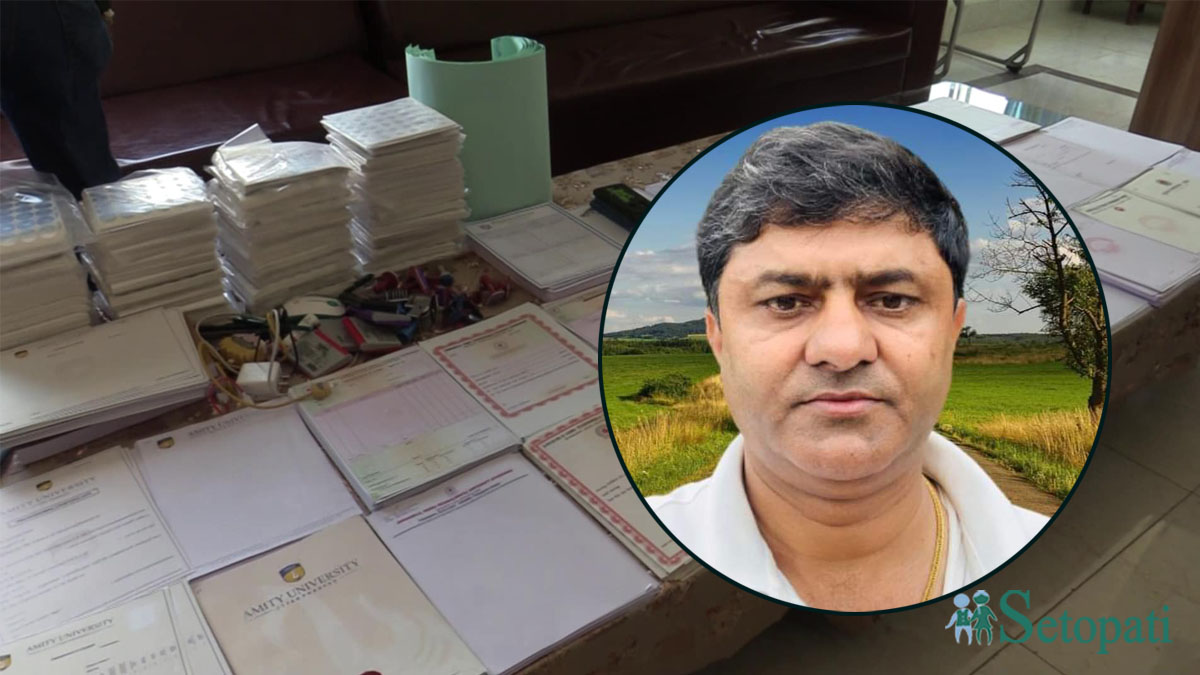 यसै गरी भारतको एमिटी विश्वविद्यालयका ८० वटा नक्कली मार्क सिट, ४० वटा प्रोभिजनल सर्टिफिकेट, ६० वटा क्यारेक्टर सर्टिफिकेट, ४९ वटा अन्य खाली प्रमाणपत्रहरू र ४० वटा खाली लोगो फेला पारेको थियो।