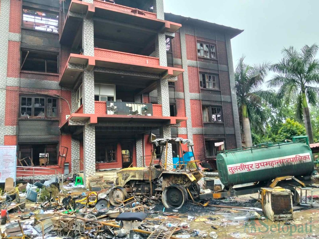 जेनजीको प्रदर्शन उग्र बन्दा तोडफोड र आगजनीले ध्वस्त पारिएको तुलसीपुर उपमहानगरपालिकामा बिहीबार बिहानसम्म आगो पुत्याइरहेको छ।