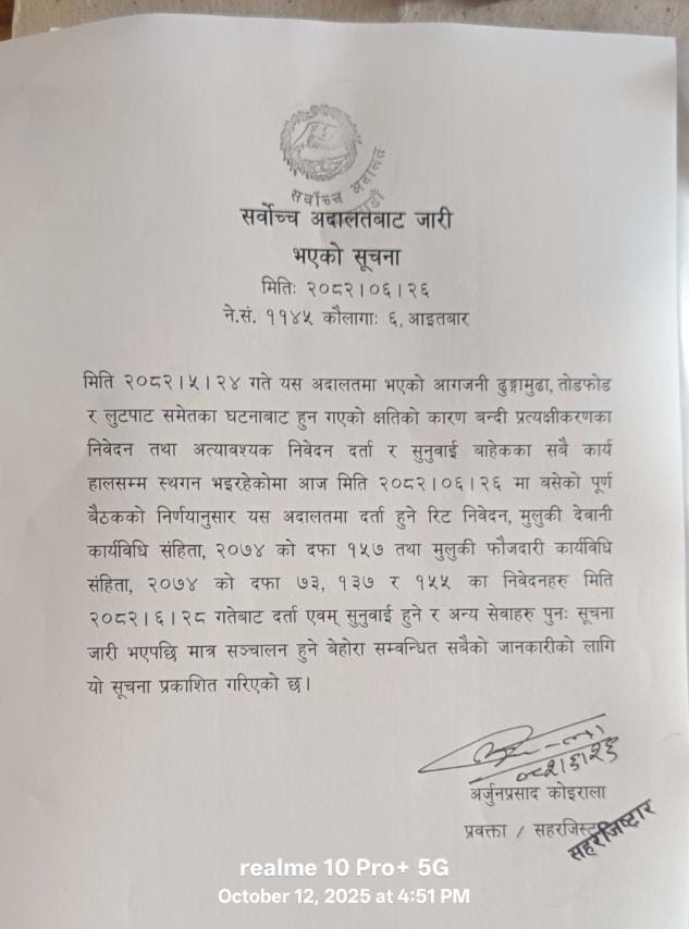 'आज मिति २०८२ साल असोज २६ मा बसेको पूर्ण बैठकको निर्णयानुसार यस अदालतमा दर्ता हुने रिट निवेदन, मुलुकी देवानी कार्यविधि संहिता, २०७४ को दफा १५७ तथा मुलुकी फौजदारी कार्यविधि संहिता को दफा ७३, १३७ र १५५ का निवेदनहरु मिति २०८२ असोज २८ गतेबाट दर्ता एवं सुनुवाई हुने र अन्य सेवाहरु पुन: सूचना जारी भएपछि मात्र सञ्चालन हुने बेहोरा सम्बन्धित सबैको जानकारीको लागि यो सूचना प्रकाशित गरिएको छ', सर्वोच्च अदालतले जारी गरेको सूचनामा उल्लेख छ।