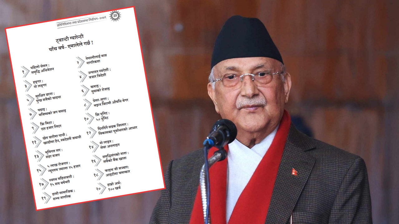 एमालेले २०७९ को निर्वाचनका लागि जारी गरेको घोषणापत्रमा 'पाँच वर्ष, एमालेले गर्छ' भन्दै २० वटा ग्यारेन्टी गरेको थियो। ती २० ग्यारेन्टीमध्ये २०८४ सालसम्म प्रतिव्यक्ति आय दोब्बर बनाउने पनि एक हो।