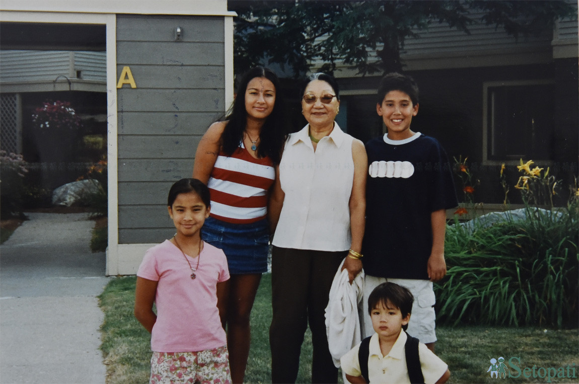 अमेरिकावासी नातिनातिनीहरूसँग रत्ना। तस्बिर सौजन्य: रत्नाको पारिवारिक संकलन