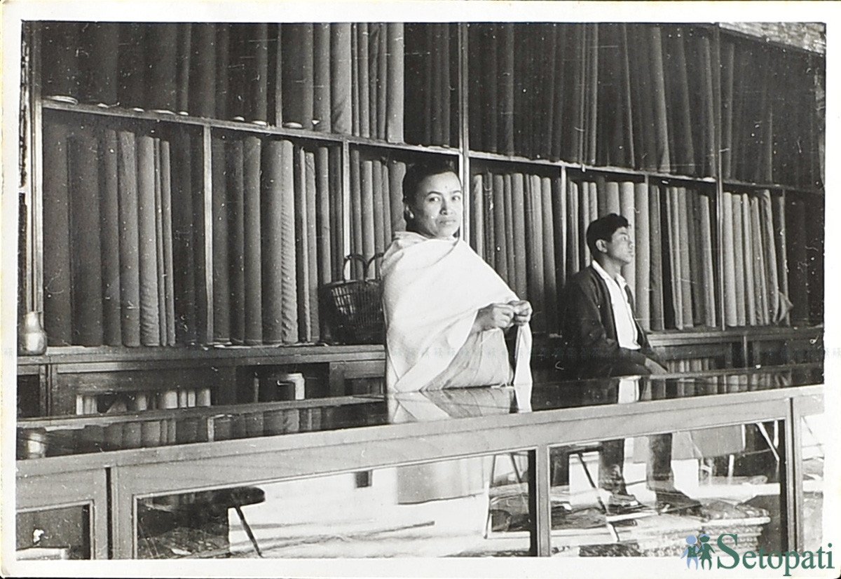 रत्नदेवी आफ्नो परिवारको कपडा पसलमा। तस्बिरः रत्नदेवीको पारीवारिक संकलन।