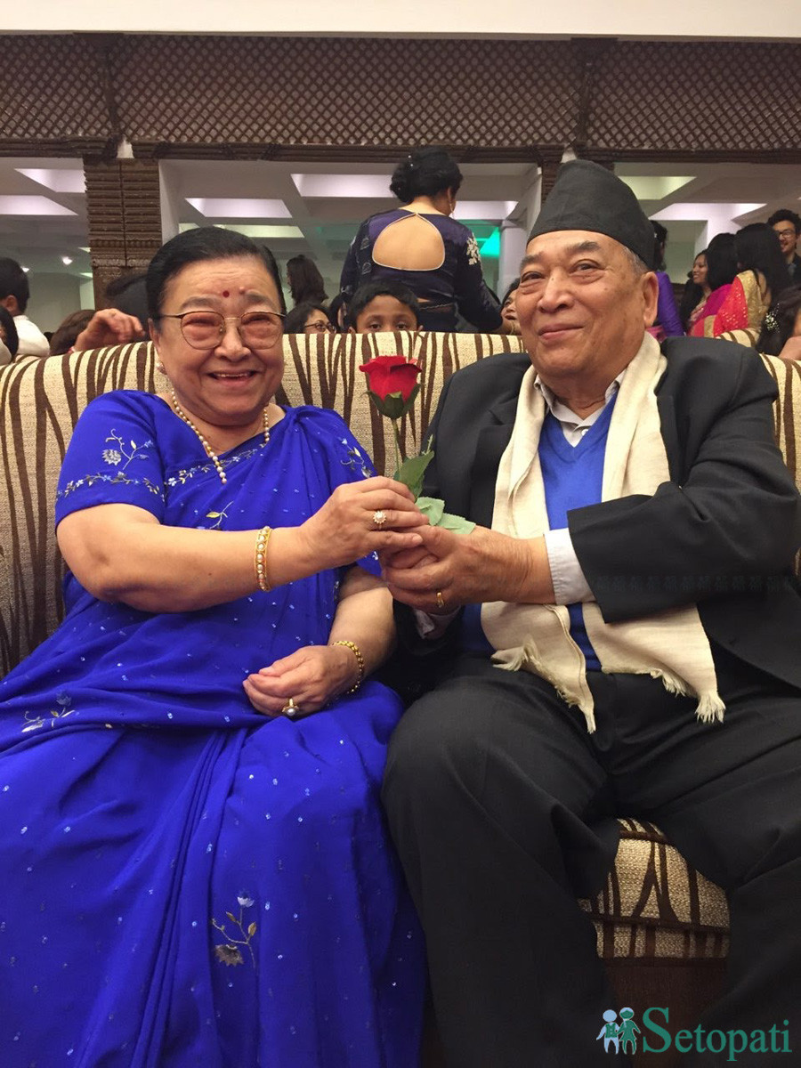 रत्नदेवीलाई गुलाबको फूल दिँदै उनका श्रीमान कुलवीरसिं तुलाधर। तस्बिरः रत्नदेवीको पारीवारिक संकलन।