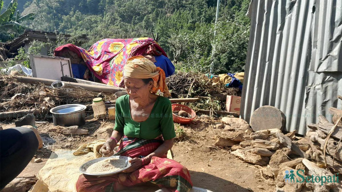 घर किनेर सडक छेउमै परिवार बसाल्ने श्रीमानको मृत्यु भएको आठ महिनापछि भुइँचालाले घरै खण्डहर बनाइदिएको छ। ५९ वर्षीया गीता र उनका दुई छोराछोरीको अबका कति समय त्रिपालमुनि बास हुने हो त्यसको केही टुंगो छैन। बढ्दो चिसो याममा छोराछोरी र आफू कसरी जोगिने भन्ने पिरलो पनि त्यत्तिकै छ।