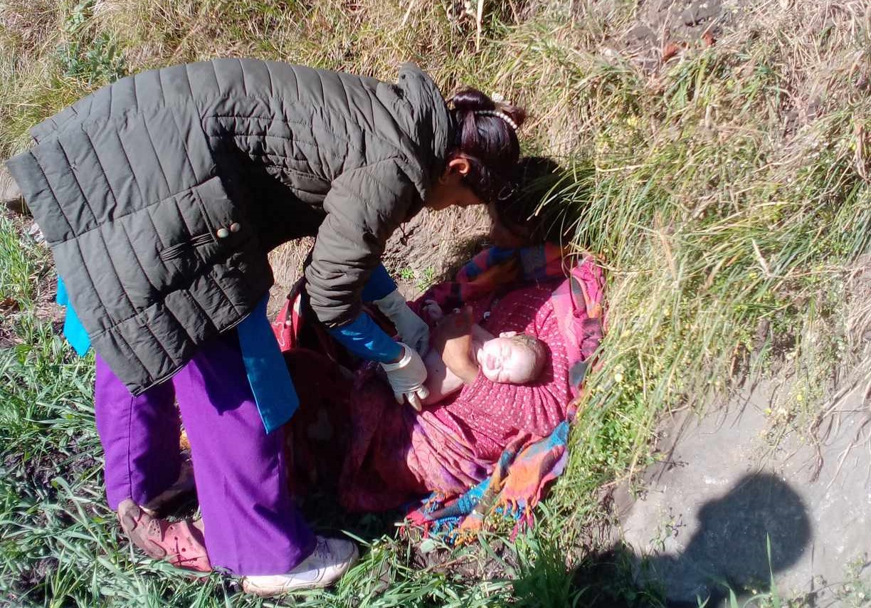 उनी धेरै गाह्रो भइरहँदा दुई घुँडा टेकेर बसिरहेकी थिइन्। त्यही अवस्थामा कार्यालय जान हिँडेकी उनकै टोलकी वडा स्वास्थ्य केन्द्र प्रमुख धर्मा चदारले देखिन्।