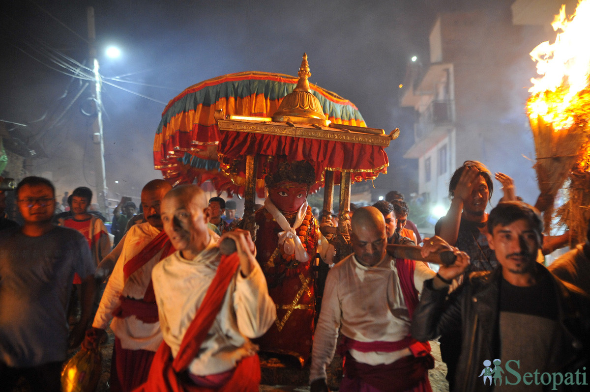 रातो मच्छिन्द्रनाथलाई खटमा हालेर बुंगमती लगिँदै। तस्बिर: नारायण महर्जन/सेतोपाटी
