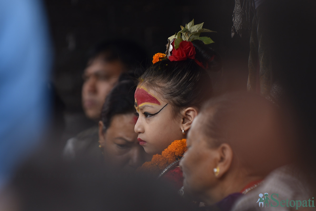 भोटो देखाउने बेला पाटनकी 'जीवित देवी' कुमारीलाई पनि ल्याउने चलन छ। तस्बिर: नारायण महर्जन/सेतोपाटी