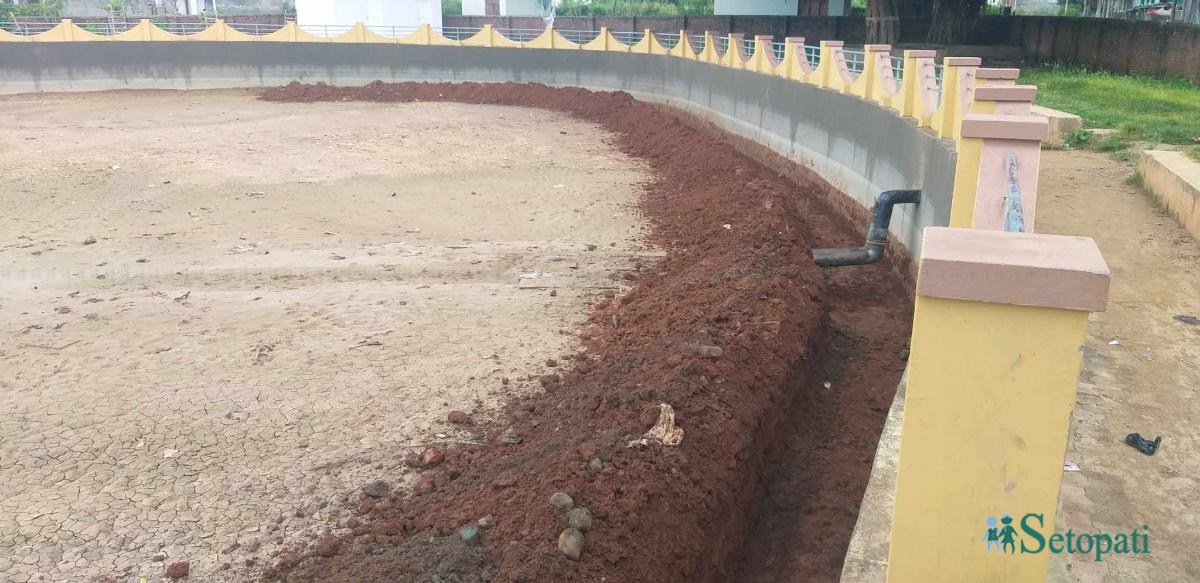 पोखरीको दक्षिण कुनोको पर्खालनेर प्वाल भेटिएपछि अघिल्लोपटक त्यसलाई पुरिएको थियो। पानी जान नरोकिएपछि यसपालि छुट्टै पक्की पर्खाल बनाउन लागिएको हो।