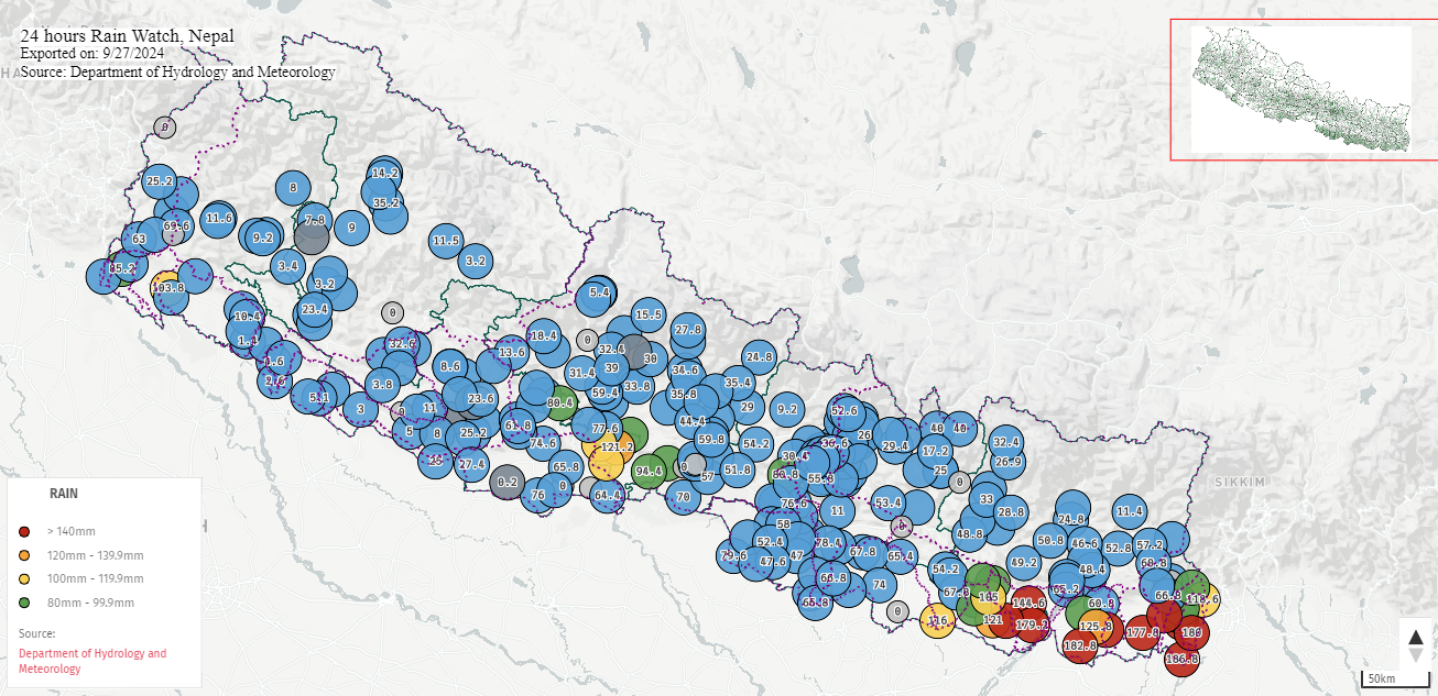 पछिल्लो २४ घन्टामा झापाको केचनामा १८७.२, चन्द्रगढी विमानस्थलमा १८३.२, अनारमनीमा १५८.६ मिलिमिटर वर्षा भएको छ।