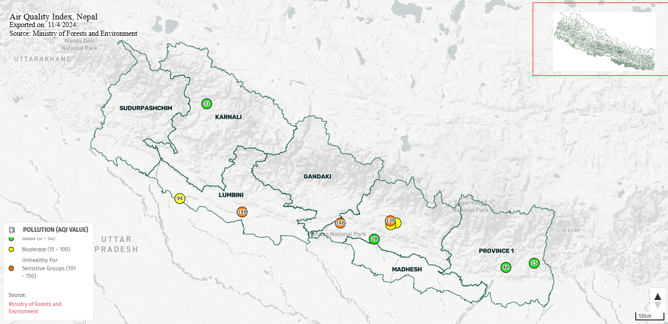 धनकुटा, मुगुको रारा, हेटौंडा इलामको वायुको गुणस्तर भने स्वस्थ देखिएको छ।