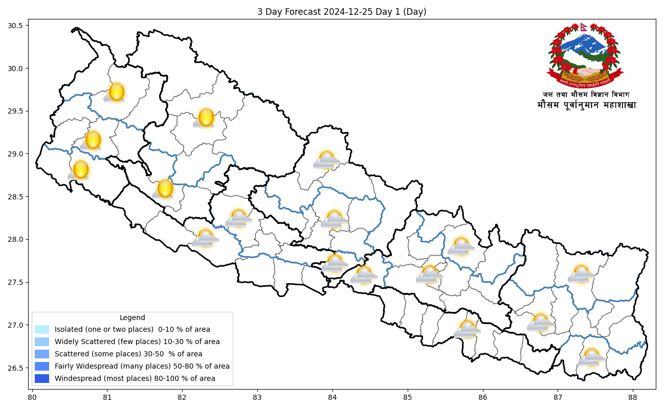 अहिले बिहान देशको मधेस, लुम्बिनी, बागमती र गण्डकी प्रदेशमा साधारणतया बदली रही देशका बाँकी भू–भागमा आंशिक बदलीदेखि मौसम मुख्यतया सफा रहेको छ। बिहानको समयमा तराई तथा उपत्यका एक दुई स्थानमा हुस्सु/कुहिरोको लागेको छ।