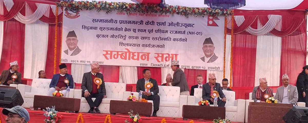 सडकको शिलान्यासको क्रममा गर्दै प्रधानमन्त्री ओलीले आजको दिन पाल्पा र रूपन्देहीको लागि मात्र नभएर देशकै महत्वपूर्ण र ऐतिहासिक दिनको रूपमा रहेको बताए।