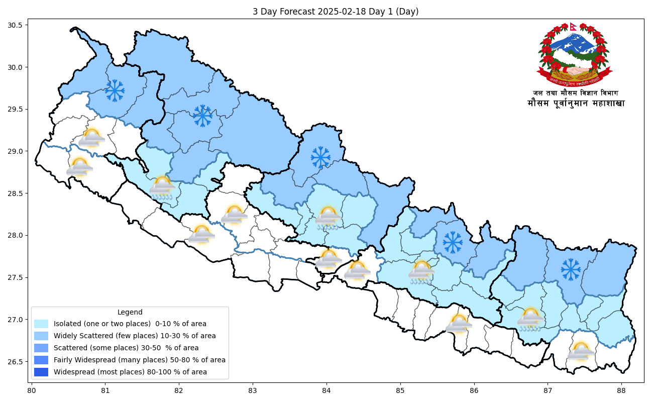 देशका उच्च पहाडी तथा हिमाली भू–भागका एक–दुई स्थानमा हल्का हिमपातको सम्भावना रहेको पनि महाशाखाले नियमित बुलेटिनमा उल्लेख गरेको छ।