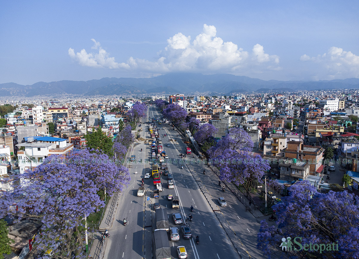 पातै ढाक्ने गरी ढकमक्क फुलेका ज्याकरान्डाको बैजनी दृश्यले काठमाडौं र ललितपुर क्षेत्र सुशोभित भइरहेको छ।