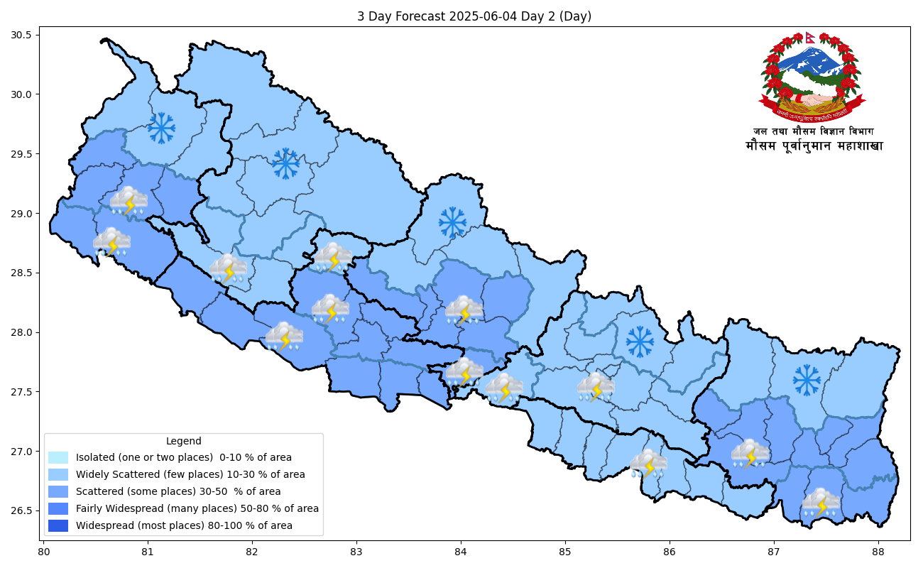 जल तथा मौसम विज्ञान विभाग, मौसम पूर्वानुमान महाशाखाले जनकपुर, महोत्तरी, रौतहट, सिराहा, धनुषा, सप्तरी, सुनसरी, मोरङ, रामेछाप, सोलुखुम्बु आसपासका ठाउँहरूमा मेघ गर्जन चट्याङ सहितको हल्कादेखि मध्यम पानी परिरहेको बताएको छ। उक्त पानी पार्ने प्रणाली उत्तर–पूर्वतिर सरिरहेको हुनाले आवश्यक सतर्कता अपनाउन महाशाखाले अनुरोध गरेको छ।