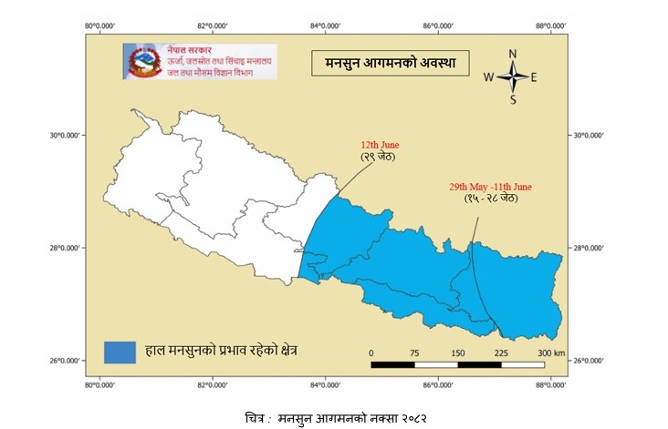 जल तथा मौसम विज्ञान विभाग, मौसम पूर्वानुमान महाशाखाले बिहीबार बुलेटिन जारी गर्दै मनसुनी वायु कोशी प्रदेशको बाँकी भू–भाग, मधेस, बागमती, गण्डकी प्रदेशका केही भू–भाग र लुम्बिनी प्रदेशका पूर्वी क्षेत्रका थोरै भू–भागमा प्रवेश गरेको बताएको हो।