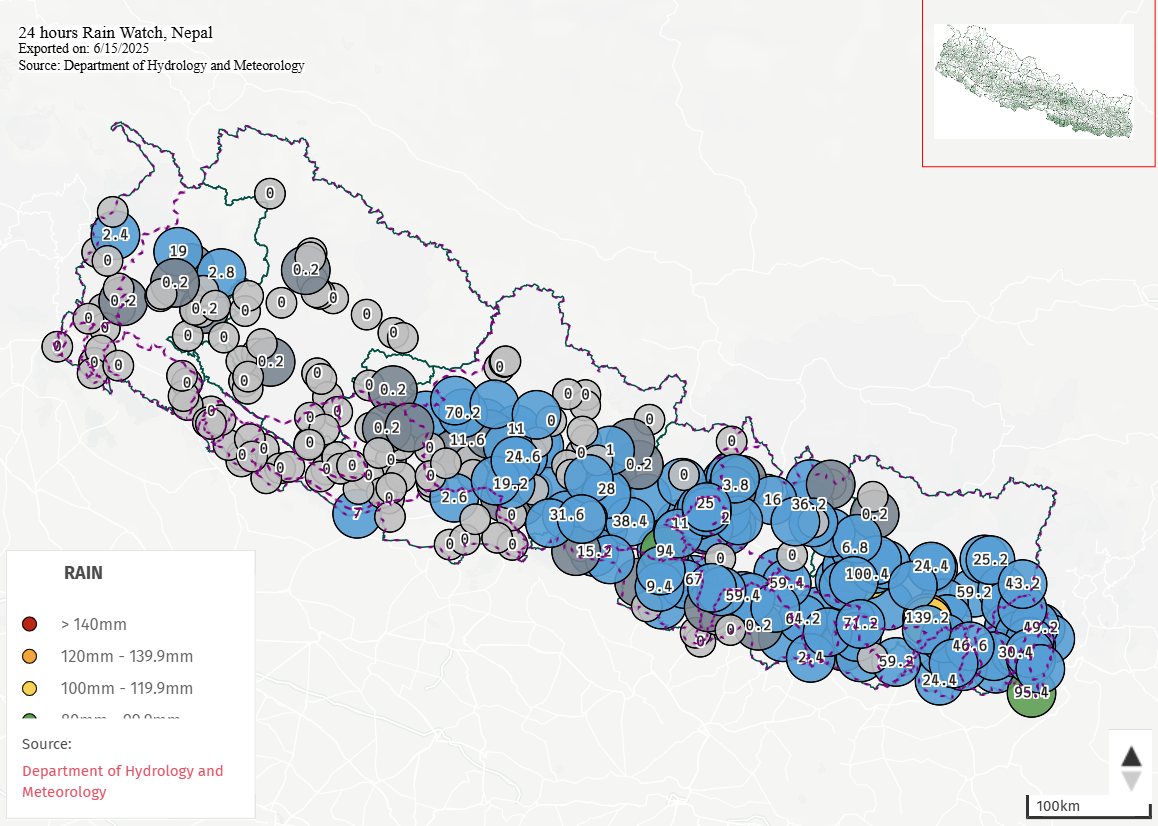 जल तथा मौसम विज्ञान विभागका अनुसार पछिल्लो २४ घन्टामा धनकुटाको मछुवाघाटमा भारी वर्षा भएको छ। त्यहाँ १४०.२ मिलिमिटर वर्षा मापन भएको छ। धनकुटाकै त्रिवेणीमा १०२.४ मिलिमिटर वर्षा मापन भएको छ। खोटाङको लामिडाँडामा १००.४ मिलिमिटर वर्षा भएको छ।