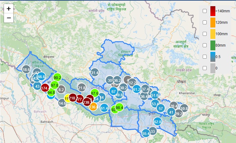 बर्दियाको मानपुर केन्द्रमा पछिल्लो २४ घन्टामा १७४.४, बाँकेको पश्चिम राप्तीमा १७७.४, दाङको अम्बापुरमा १९३.२ मिलिमिटर वर्षा भएको छ।