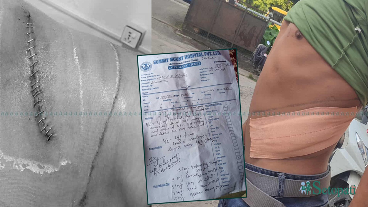 उनको पेटको बायाँ भागमा २२ वटा टाँका लगाइएको छ। त्यो घाउँदेखेपछि उनका परिवारले मिर्गौला निकालिएको हुनसक्ने भनेर समिट माउन्ट अस्पतालमा चेकजाँच गराए।