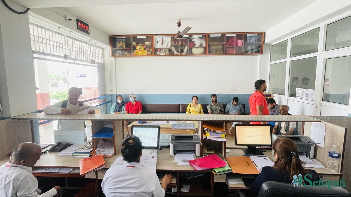 कोही लेख्दै, कोही अघिल्तिरको काउन्टरमा उभिएर सोधपुछ गर्दै छन्। काउन्टरभित्र कर्मचारीहरू काममा व्यस्त छन्।