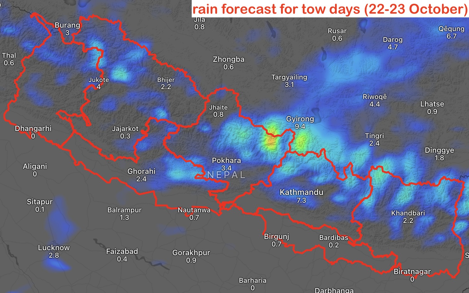 कात्तिक ५ गते गोबर्द्धन पूजाका दिन देशको पहाडी भूभागमा आंशिकदेखि साधारणतया बदली तथा बाँकी भूभागमा मौसम मुख्यतया सफा रहने छ। कोशी प्रदेश र कर्णाली प्रदेशको उच्च पहाडी तथा हिमाली भूभागका एक–दुई स्थानमा हल्का हल्का वर्षा/हिमपातको सम्भावना छ।