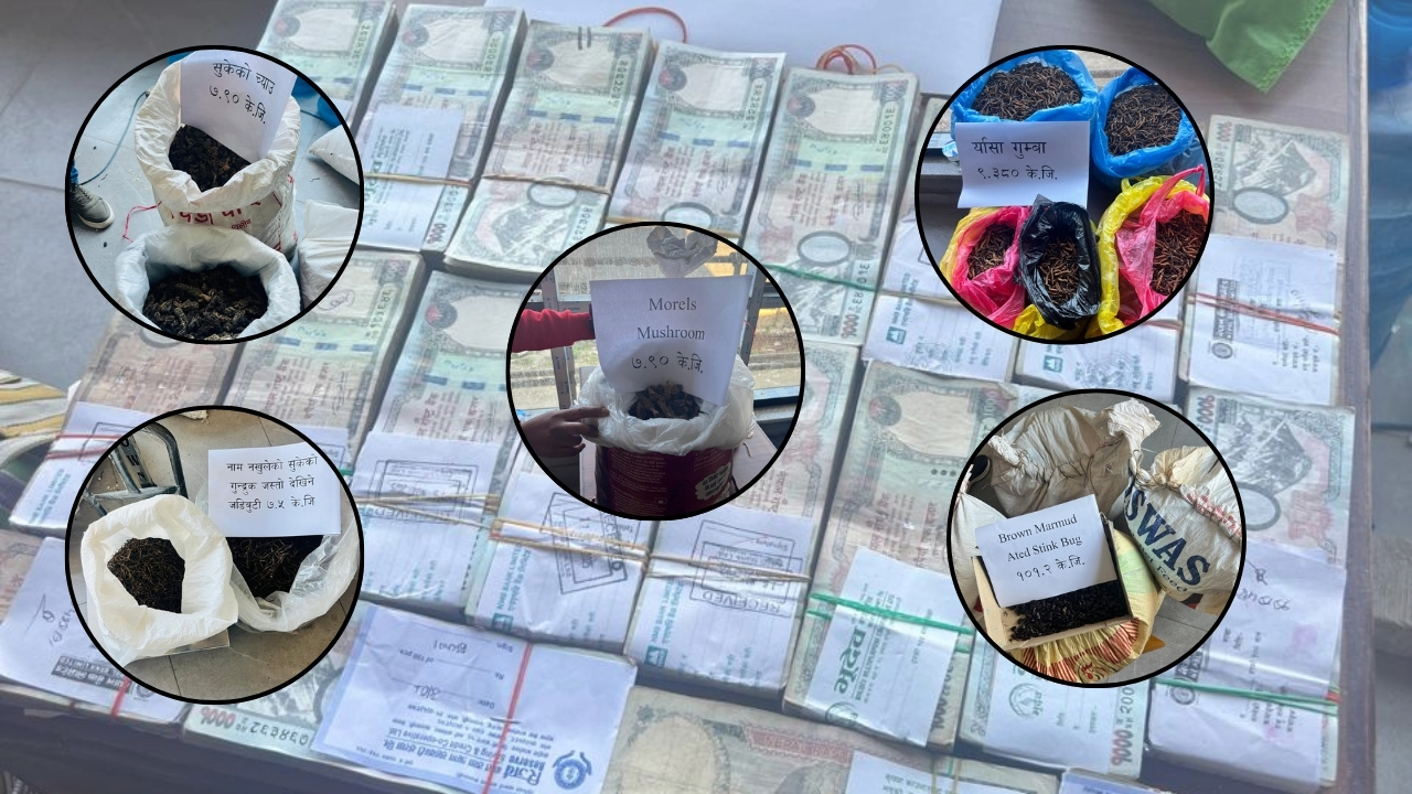९ किलो ३६० ग्राम यार्सागुम्बा, १५७ किलो वन लसुन, १०१ किलो किटपतंग, ७ किलो ९०० ग्राम गुच्ची च्याउ, गुन्द्रुक जस्तो ७ किलो ५०० ग्राम, तौलिने मेसिन लगायत प्रहरीले बरामद गरेको छ।