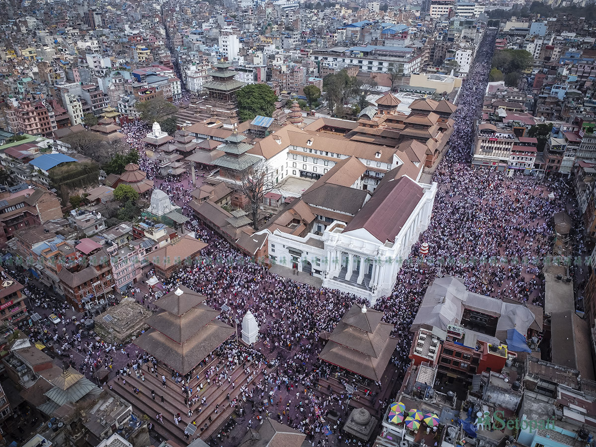 ड्रोन भ्यूले बसन्तपुरको ऐतिहासिक सौन्दर्य र होलीको सांस्कृतिक रौनकलाई एउटै फ्रेममा समेटेको छ।