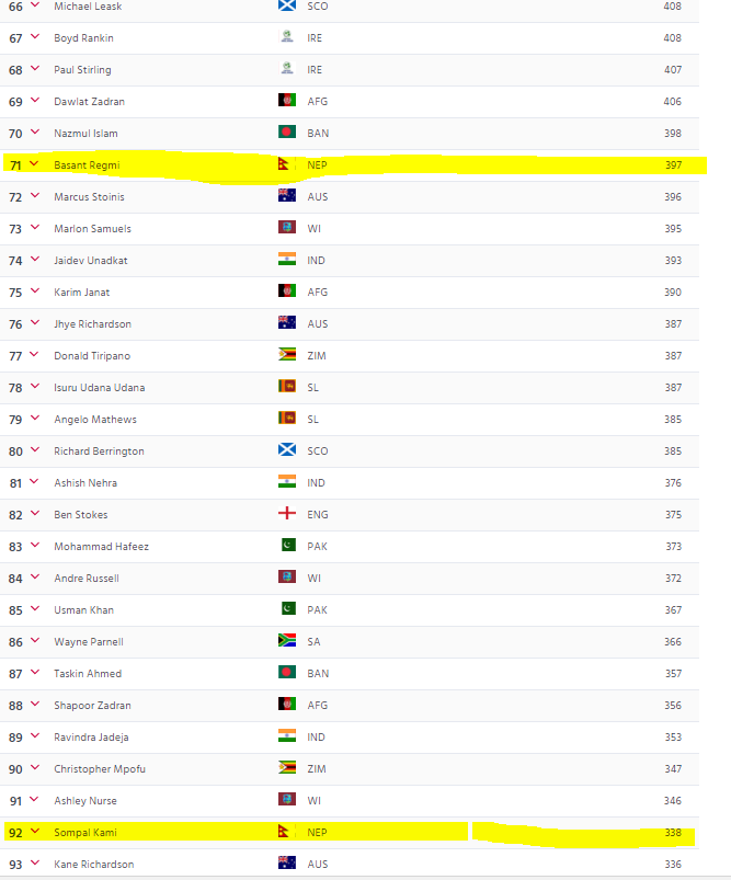 ब्याटिङतर्फ कप्तान पारस खड्का र शरद भेषावाकर तथा बलिङतर्फ बसन्त रेग्मी र सोमपाल कामी शीर्ष १०० भित्र अटाएका हुन् । १२ अन्तर्राष्ट्रिय खेलमा २३६ रन बनाएका थिए भने भेषावकरले ११ खेलबाट १९९ रन बनाएका थिए।