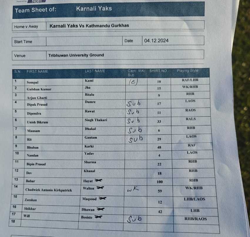 नेपाल प्रिमियर लिग (एनपिएल) मा कर्णाली याक्सविरूद्ध काठमाडौं गुर्खाजले टस जितेको छ।