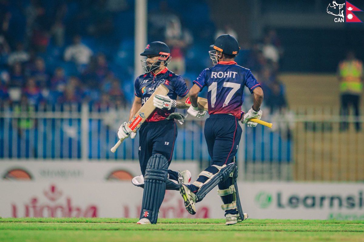 मंगलबार शारजाह रंगशालामा जारी खेलमा नेपालले १० विकेट गुमाएर १२२ रन बनाएको हो। एक बल बाँकी रहँदै १०औं विकेट गुमेको थियो।