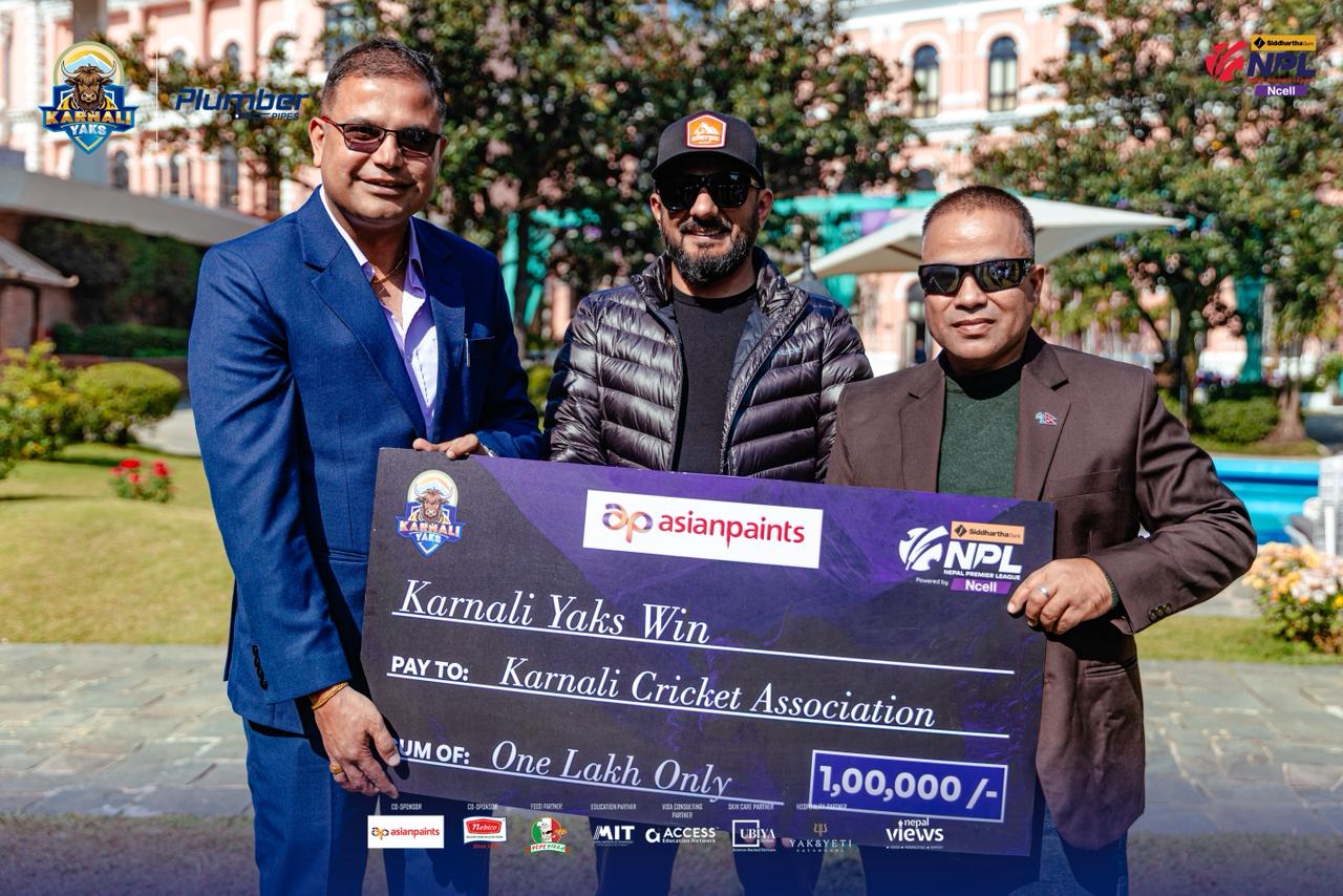 कर्णाली याक्सले दोस्रो नेपाल प्रिमियर लिग (एनपिएल)मा पहिलो जित निकालेसँगै एसियन पेन्ट्सले कर्णाली प्रदेश क्रिकेट एसोसियसनलाई एक लाख रुपैँया हस्तान्तरण गरेको छ ।