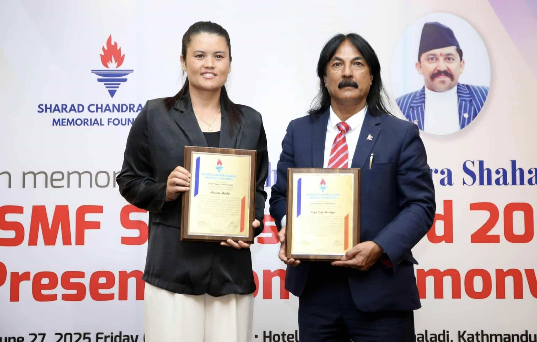 शरदचन्द्र शाह स्मृति फाउण्डेसनले शुक्रवार एक कार्यक्रम आयोजनामा गर्दै पूर्वफुटबलर शाक्य र नेपाली महिला टोलीकी कप्तान अरूणा शाही सम्मानित भएकी हुन् । फाउण्डेसनले दुवैलाई एससिएसएमएफ स्पोट्र्स अवार्ड २०२५ र नगद दुई लाख ५० हजार रूपैयाँ सम्मानित गरेको हो । फाउन्डेसनकी अध्यक्ष रेणु शाहलाई अवार्ड र नगद पुरस्कार प्रदान गर्दै उनीहरूलाई सम्मान गरेकी हुन् ।