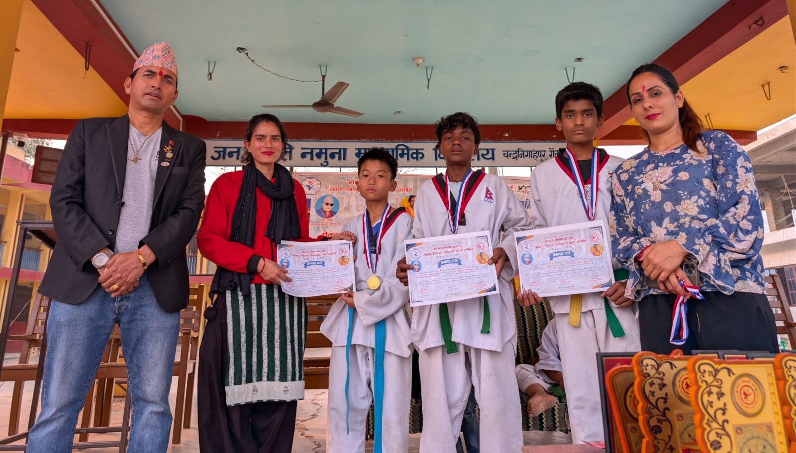 समापनमा चौथो माउन्ट एभरेस्ट तेक्वान्दोमा स्वर्ण पदक जितेका चन्द्रपुर नगरपकालिकाका खेलाडी केनिश खड्कलाई सम्मान गरिएको छ।