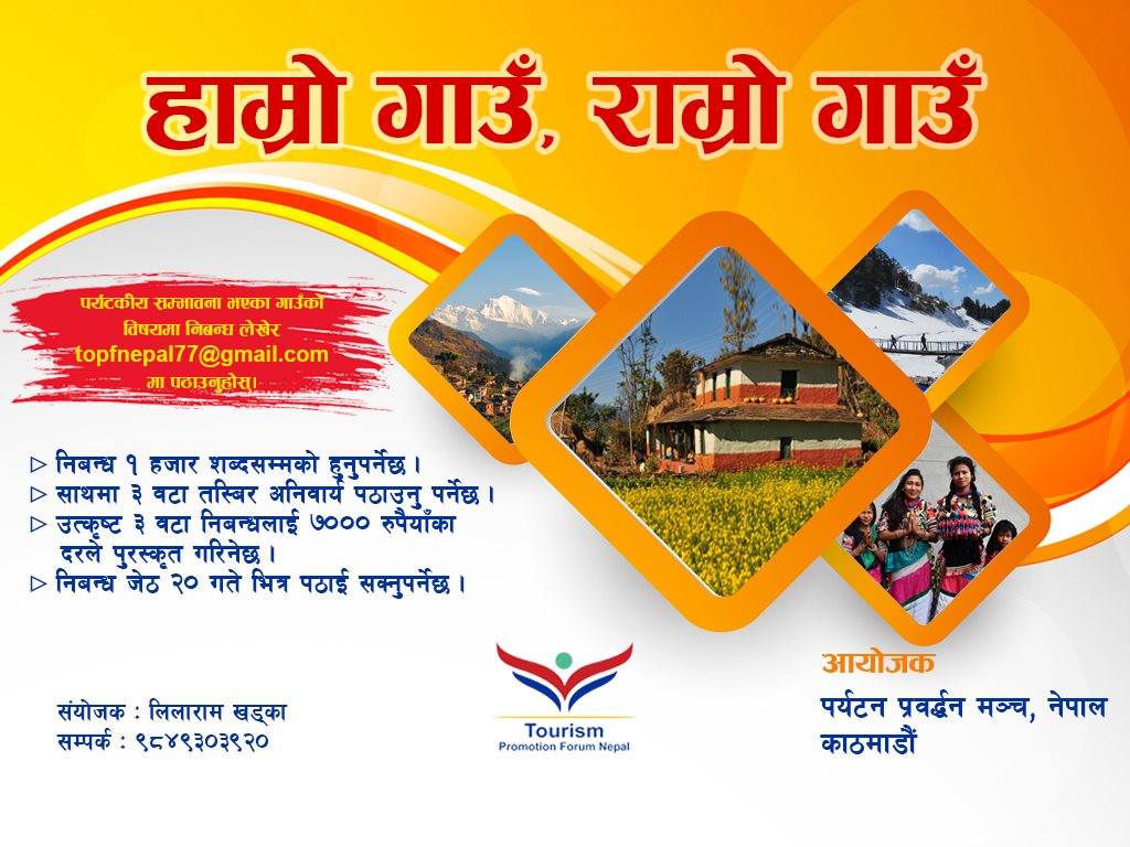 लकडाउनमा घरभित्रै बसिरहेका बेला आफ्नो गाउँको विषयमा निबन्ध लेखेर जित्न सक्नुहुनेछ पुरस्कार। त्यसका लागि ‘पर्यटन प्रवर्द्धन मञ्च, नेपाल’ले ‘हाम्रो गाउँ, राम्रो गाउँ’ निबन्ध लेखन प्रतियोगिता आयोजना गरेको छ।