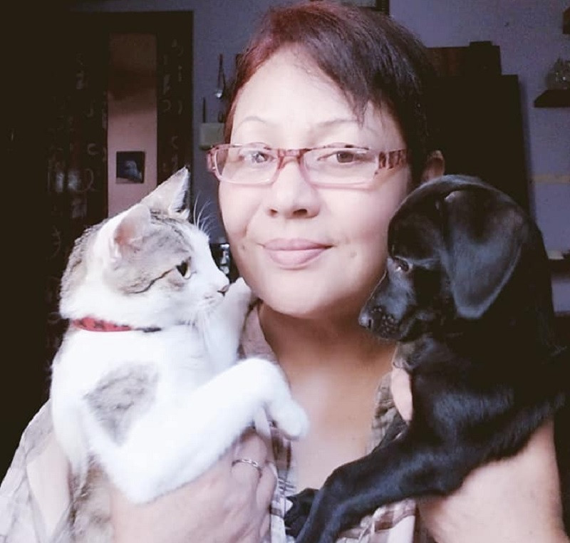 कलाकार गौरी मल्ल आफ्ना कुकुर र बिरालोसँग। तस्बिर स्रोतः गौरी मल्लको फेसबुक