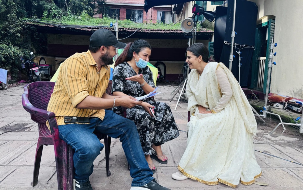 प्राप्त तस्बिरमा रेखालाई 'ह्रस्व दीर्घ' को छायांकन सेटमा देख्न सकिन्छ। जहाँ निर्देशक चन्द्र पन्त र निर्मात्री एवं अभिनेत्री नीता ढुंगानासँग स्क्रिप्टमा छलफल गरिरहेको देखिन्छ।