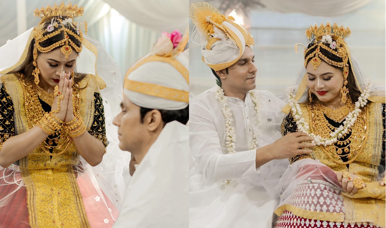त्यस्तै लिनले सेतो र गुलाबी रंगको मणिपुरी सारी लगाएकी छन्। उनीहरूको विवाहमा परिवारका सदस्य र साथीभाइ मात्रै सहभागी थिए।
